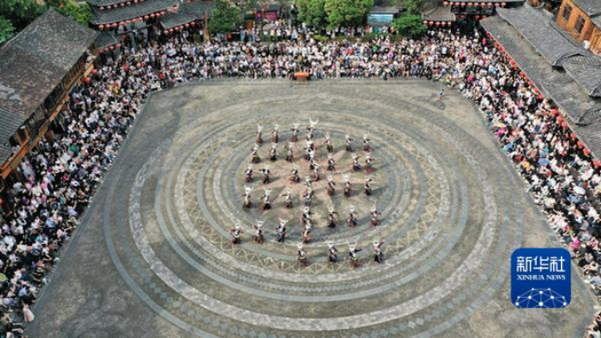 5月2日,游客在贵州省黔东南苗族侗族自治州雷山县西江千户苗寨观看民族歌舞表演(无人机照片)。(吴贤燕 摄)